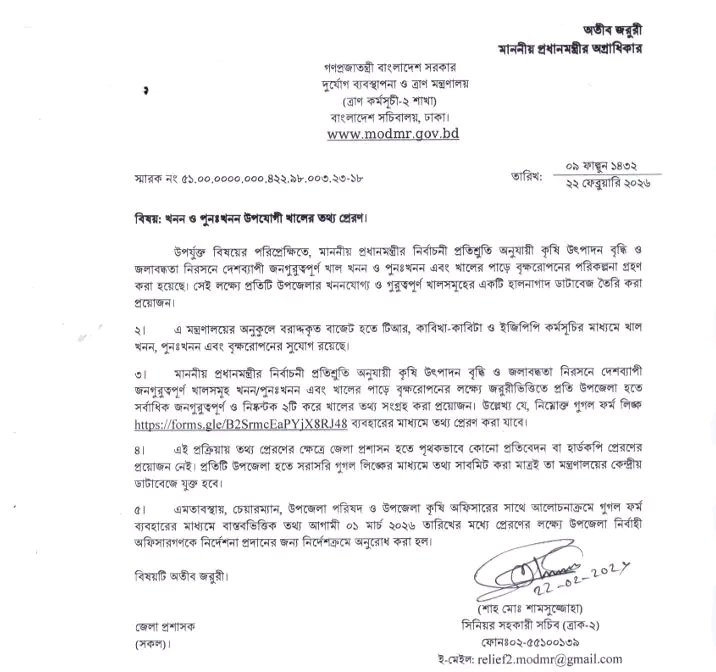 উপজেলা পরিষদের চেয়ারম্যান ও উপজেলা কৃষি কর্মকর্তার সঙ্গে সমন্বয় করে বাস্তবভিত্তিক তথ্য আগামী ১ মার্চ ২০২৬-এর মধ্যে পাঠাতে উপজেলা নির্বাহী কর্মকর্তাদের প্রয়োজনীয় নির্দেশনা দিতে জেলা প্রশাসকদের অনুরোধ করা হয়েছে।