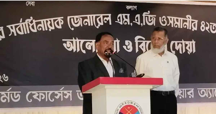 সোমবার (১৬ ফেব্রুয়ারি) দুপুরে রাজধানীর রাওয়া ক্লাবে মহান মুক্তিযুদ্ধের সর্বাধিনায়ক জেনারেল (অব.) এম এ জি ওসমানীর ৪২তম মৃত্যুবার্ষিকী উপলক্ষে আয়োজিত আলোচনা সভায় তিনি এ কথা বলেন।