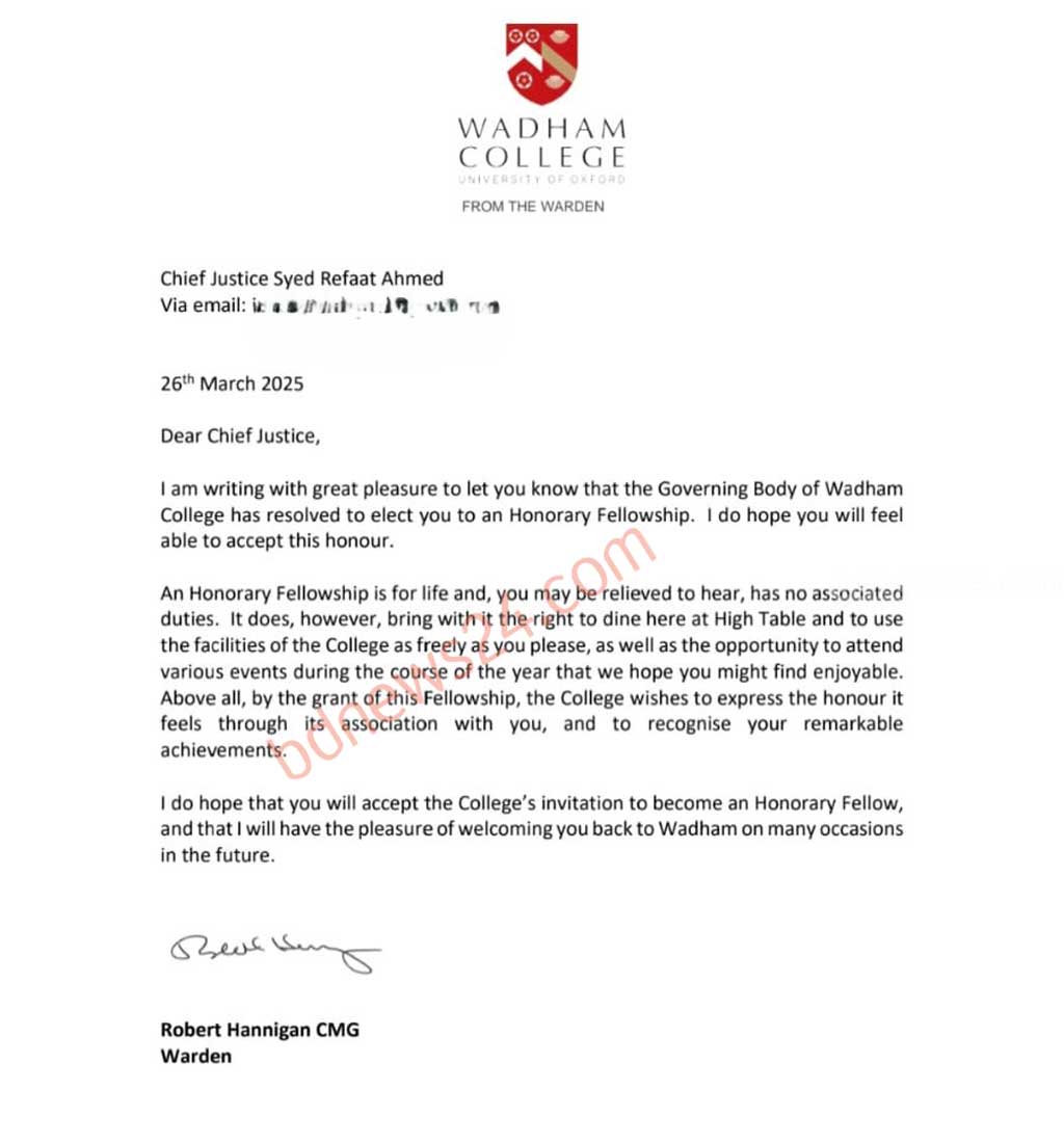 নিজস্ব প্রতিবেদক।।বাংলাদেশের প্রধান বিচারপতি সৈয়দ রেফাত আহমেদকে ‘অনারারি ফেলোশিপ’ দিয়ে সম্মানিত করল অক্সফোর্ড বিশ্ববিদ্যালয়।