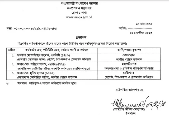 প্রজ্ঞাপনে বলা হয়েছে,পেটেন্ট, শিল্প-নকশা ও ট্রেডমার্কস অধিদপ্তরের রেজিস্ট্রার (অতিরিক্ত সচিব) খন্দকার মোস্তাফিজুর রহমানকে জাতীয় গৃহায়ন কর্তৃপক্ষের চেয়ারম্যান, জনশক্তি কর্মসংস্থান ও প্রশিক্ষণ ব্যুরোর মহাপরিচালক (অতিরিক্ত সচিব) মো. শহীদুল আলমকে কলকারখানা ও প্রতিষ্ঠান পরিদর্শন অধিদপ্তরের মহাপরিদর্শক,জাতীয় গৃহায়ন কর্তৃপক্ষের চেয়ারম্যান (অতিরিক্ত সচিব) মো. মুনিম হাসানকে পেটেন্ট,শিল্প-নকশা ও ট্রেডমার্কস অধিদপ্তরের রেজিস্ট্রার করা হয়েছে।