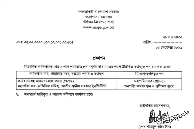 এদিকে গ্রেড-১ পদে পদোন্নতি পেয়েছেন জাতীয় স্থানীয় সরকার ইনস্টিটিউটের মহাপরিচালক (অতিরিক্ত সচিব) সালেহ আহমদ মোজাফফর। পদোন্নতির পর তাকে বদলি করে জনশক্তি কর্মসংস্থান ও প্রশিক্ষণ ব্যুরোর মহাপরিচালক (গ্রেড-১) করা হয়েছে।