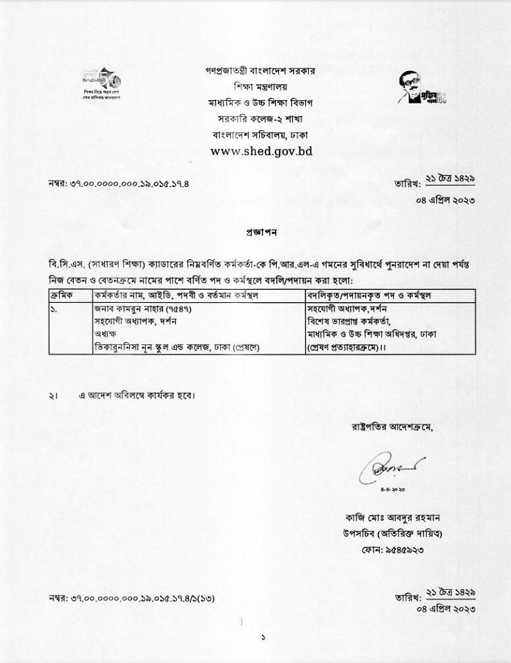 মঙ্গলবার (৪ এপ্রিল) শিক্ষা মন্ত্রণালয়ের মাধ্যমিক ও উচ্চ শিক্ষা বিভাগের উপ সচিব কাজি মো. আবদুর রহমান স্বাক্ষরিত প্রজ্ঞাপনে এ আদেশ জারি করা হয়।