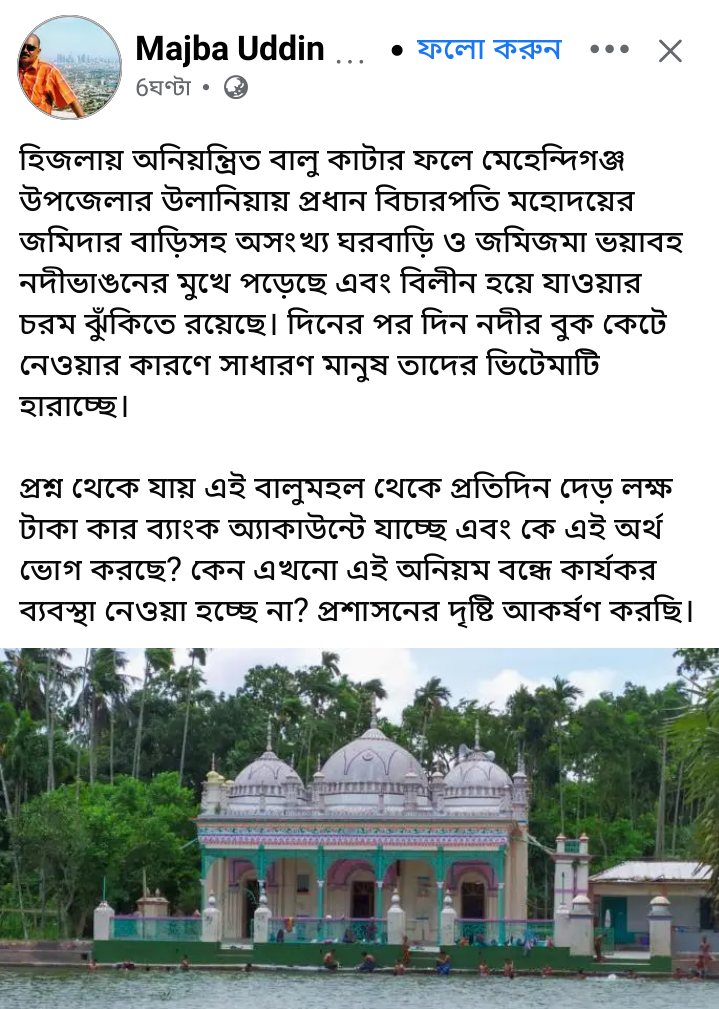 মেহেন্দিগঞ্জ(বরিশাল)প্রতিনিধি।।মেহেন্দিগঞ্জ-হিজলা উপজেলার অনিয়ন্ত্রিত বালু উত্তোলনের ফলে মেহেন্দিগঞ্জ উপজেলার উলানিয়া এলাকায় ভয়াবহ নদীভাঙনের আশঙ্কা দেখা দিয়েছে। স্থানীয়দের অভিযোগ,দিনের পর দিন নদীর বুক কেটে বালু নেওয়ার কারণে প্রধান বিচারপতি মহোদয়ের জমিদার বাড়িসহ অসংখ্য ঘরবাড়ি,ফসলি জমি ও স্থাপনা মারাত্মক ঝুঁকির মুখে পড়েছে।যেকোনো সময় এসব বসতভিটা ও জমিজমা নদীগর্ভে বিলীন হয়ে যেতে পারে বলে আশঙ্কা করছেন এলাকাবাসী।