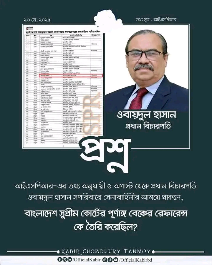 এ রকম স্পষ্ট রেফারেন্স প্রায় সকল সংবাদ মাধ্যমে প্রকাশিত হওয়ার পর অন্তর্বর্তী সরকারের সাংবিধানিক ভিত্তি নিয়ে সৃষ্ট সংশয় ও ধূম্রজাল কাটে।তা সত্ত্বেও ভারতে পালিয়ে যাওয়া শেখ হাসিনা ড. মুহাম্মদ ইউনূস নেতৃত্বাধীন সরকারকে ‘অবৈধ সরকার’ বলে সারিন্দা বাজিয়ে আসছেন ২০২৪ সালের ৮ আগস্টের পর থেকে।হাসিনার যারা দোহার-আইনজীবী রয়েছেন তারাও হুক্কাহুয়া রবে একই সারিন্দা বাজাচ্ছেন।অথচ বহুবার,বহুভাবে এ কথা বলা হয়েছে যে,তৎকালীন প্রধান বিচারপতি ওবায়দুল হাসান নেতৃত্বাধীন সাত সদস্যের আপিল বিভাগীয় বেঞ্চ প্রেসিডেন্ট মোহাম্মদ সাহাবুদ্দিনের চাওয়া রেফারেন্ডামের ওপর অ্যাটর্নি জেনারেলের শুনানি নিয়েছেন।