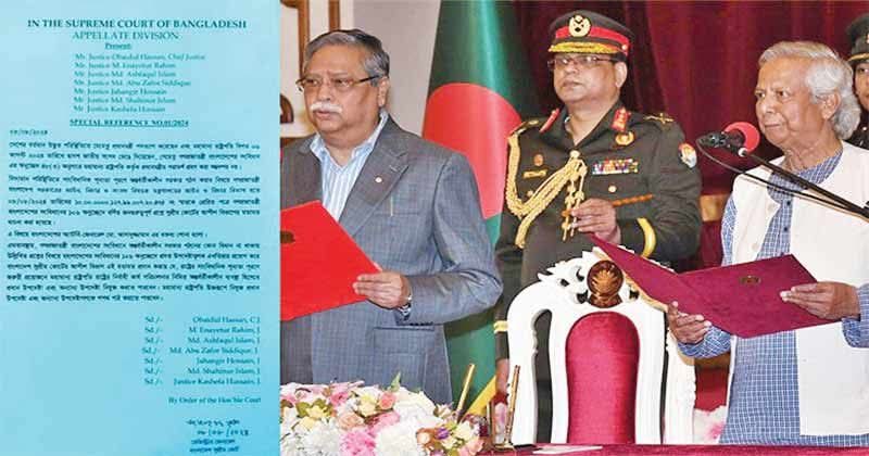 নিজস্ব প্রতিবেদক।।যে প্রশ্ন শেখ হাসিনা তুলতেন, এখন সেই প্রশ্ন তুলছে জামায়াতে ইসলামী।গতবছর ৫ আগস্ট হাসিনা ভারত পালিয়ে যান।সুপ্রিমকোর্টের স্পেশাল রেফারেন্সের ভিত্তিতে ওই বছর ৮ আগস্ট সংবিধান অনুসারে ড. মুহাম্মদ ইউনূসের নেতৃত্বে শপথ গ্রহণ করে অন্তর্বর্তী সরকার।মহামান্য প্রেসিডেন্ট মোহাম্মদ সাহাবুদ্দিন ত্বরিত সিদ্ধান্তে সংবিধানের ১০৬ অনুচ্ছেদ অনুযায়ী সুপ্রিমকোর্টের স্পেশাল চেয়ে পাঠান। তৎকালীন প্রধান বিচারপতি ওবায়দুল হাসানের নেতৃত্বে আপিল বিভাগের পূর্ণাঙ্গ বেঞ্চ শুনানি নিয়ে এই মর্মে মতামত দেন যে, প্রেসিডেন্ট একজনকে প্রধান উপদেষ্টা নিয়োগ দিতে পারেন। সুপ্রিম কোর্টের মতামত ও বৈধতা পাওয়ার পর প্রেসিডেন্ট গতবছর ৮ আগস্ট ড. মুহাম্মদ ইউনূসকে অন্তর্বর্তীকালীন সরকারের প্রধান উপদেষ্টা হিসেবে শপথ পাঠ করান।