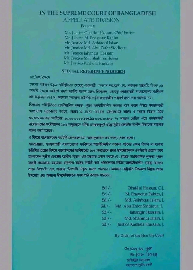 এ মামলার শুনানিতে আইনজীবীরা বলেন, গণঅভ্যুত্থানের পর গঠন হওয়া সরকারের বৈধতা নিয়ে প্রশ্ন তোলার সুযোগ নেই। যে সরকার শপথ নেওয়ার পর সুপ্রিম কোর্ট পুনর্গঠন করেছে, সেই আদালতে গিয়েই সেই সরকারের বৈধতা নিয়ে প্রশ্ন তোলা স্ববিরোধী।যদিও রিটকারী আইনজীবীর মূল যুক্তি হচ্ছে যে, ৫ আগস্টের গণঅভ্যুত্থানের মুখে তৎকালীন প্রধান বিচারপতিসহ আপিল বিভাগের বিচারপতিরা ক্যান্টনমেন্টে আশ্রয় নিয়েছিলেন।ফলে তারা সংবিধানের ১০৬ অনুচ্ছেদ অনুযায়ী সরকার গঠনের বিষয়ে রাষ্ট্রপতির রেফারেন্সের মতামত দেওয়ার সুযোগ নেই।এতে বর্তমান সরকারের শপথ ও গঠন প্রক্রিয়া অবৈধ হয়েছে।