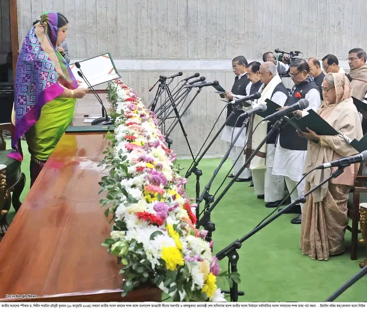 বুধবার (১০ জানুয়ারি) সকাল সোয়া ১০টায় জাতীয় সংসদ ভবনের শপথ কক্ষে আওয়ামী লীগের অন্যান্য সংসদ সদস্যদের সঙ্গে শেখ হাসিনাকে শপথ বাক্য পাঠ করান স্পিকার ড. শিরীন শারমিন চৌধুরী।