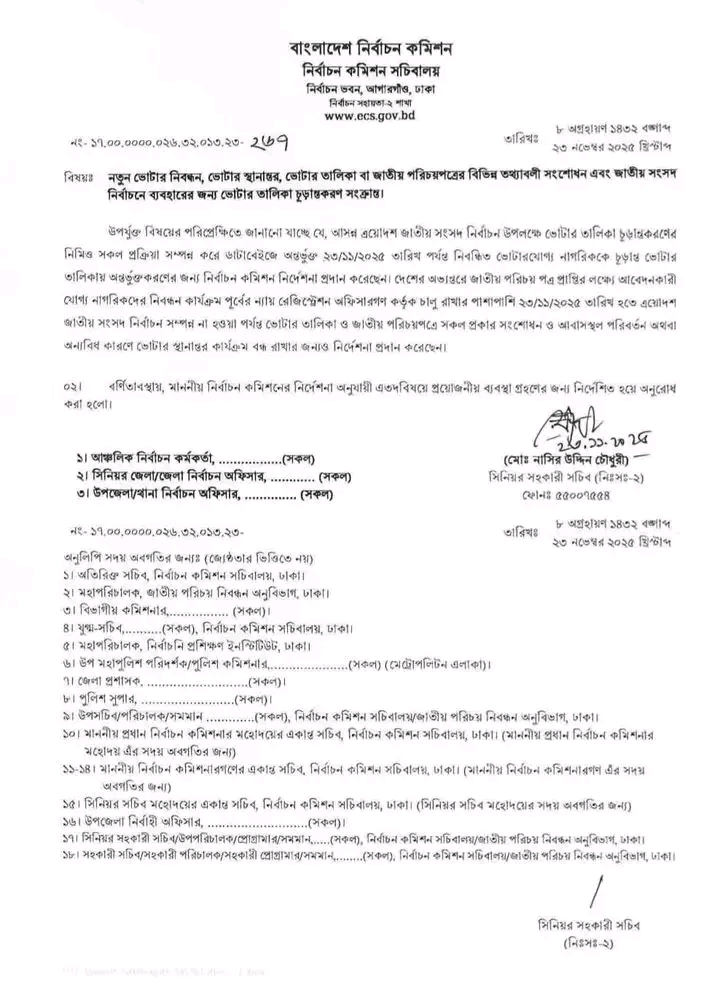 নিজস্ব প্রতিবেদক।।বাংলাদেশ নির্বাচন কমিশন ২৩ নভেম্বর ২০২৫ তারিখে নতুন ভোটার নিবন্ধন,ভোটার স্থানান্তর এবং ভোটার তালিকা চূড়ান্তকরণের নির্দেশনা প্রদান করেছে।দেশের নাগরিকদের জন্য এই নির্দেশনা স্পষ্ট – নির্বাচনের আগে আর কোনো ভোটার স্থানান্তর বা সংশোধন কার্যক্রম চালানো যাবে না।