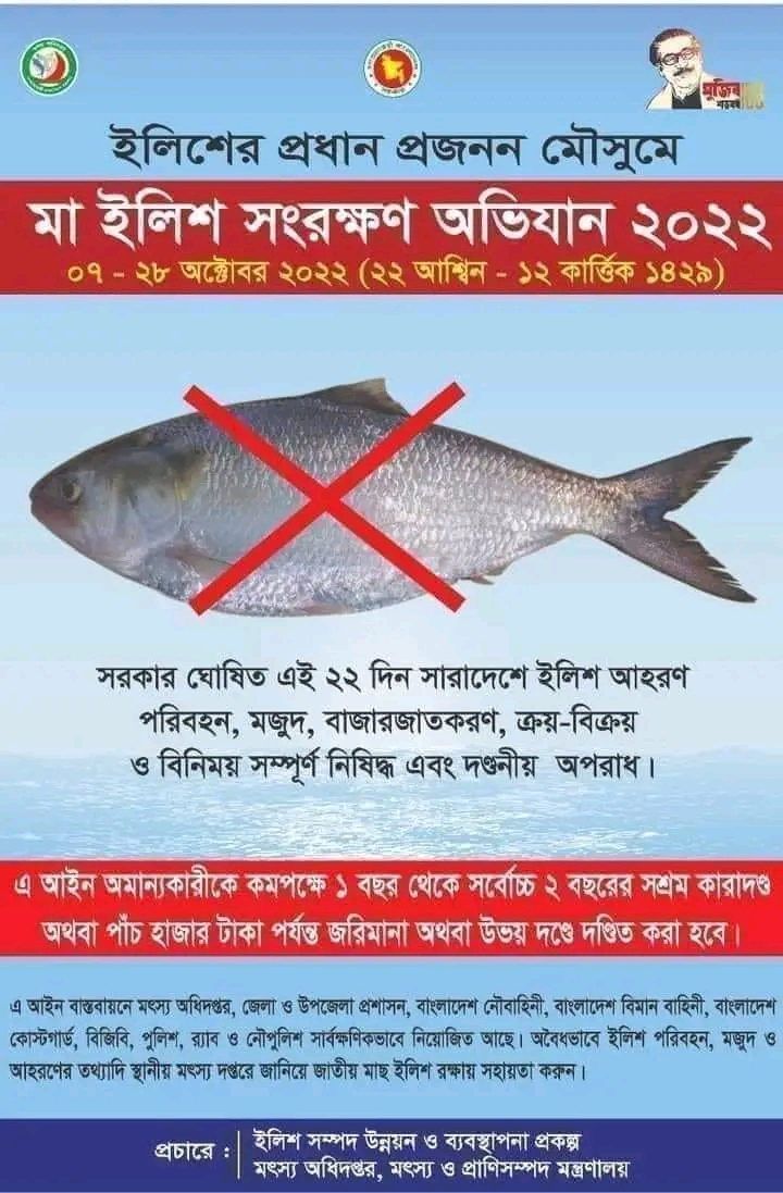 বিজ্ঞপ্তিতে বলা হয়েছে, ইলিশের নিরাপদ প্রজননের লক্ষ্যে ৭ থেকে ২৮ অক্টোবর পর্যন্ত ২২ দিন সারা দেশে ইলিশ আহরণ, পরিবহন, ক্রয়-বিক্রয়, মজুত ও বিনিময় নিষিদ্ধ থাকবে। মৎস্য ও প্রাণিসম্পদ মন্ত্রণালয় প্রতি বছরের মতো এবারো ইলিশের প্রজনন নির্বিঘ্নে করতে এ সিদ্ধান্ত নিয়েছে।