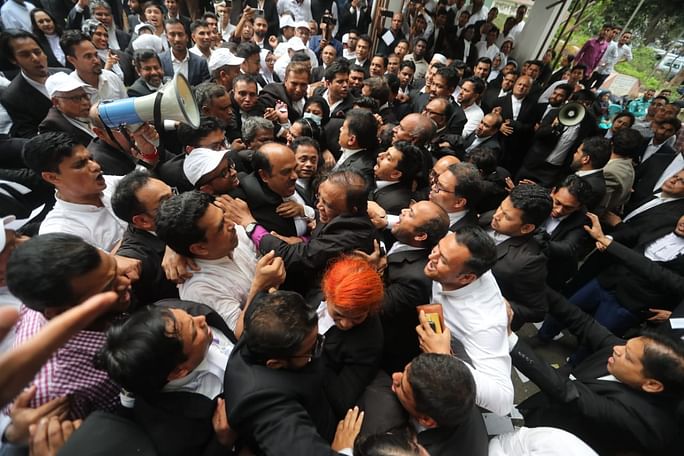 আদালত প্রাঙ্গণে নজীরবিহীন ঘটনা গতকাল ঘটেছে,যা চলমান।আজও রুমে তালা লাগানো আছে,অনেকের রুমের চারপাশে পুলিশ দেওয়া হয়েছে।বাইরে থেকে এ ঘটনার পেছনে কেউ আছে কিনা তা দেখতে হবে।এই অঙ্গনে এটা কি অনুমোদিত? তারা সমিতির জ্যেষ্ঠ সদস্যদেরও নির্যাতন করেছে।আমরা সুরক্ষা চাচ্ছি।