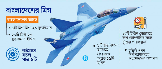 সূত্র জানায়,আটটি মিগ-২৯ যুদ্ধবিমান উড্ডয়ন ও পরিচালনার জন্য অন্তত ১৬টি সচল ইঞ্জিন প্রয়োজন।