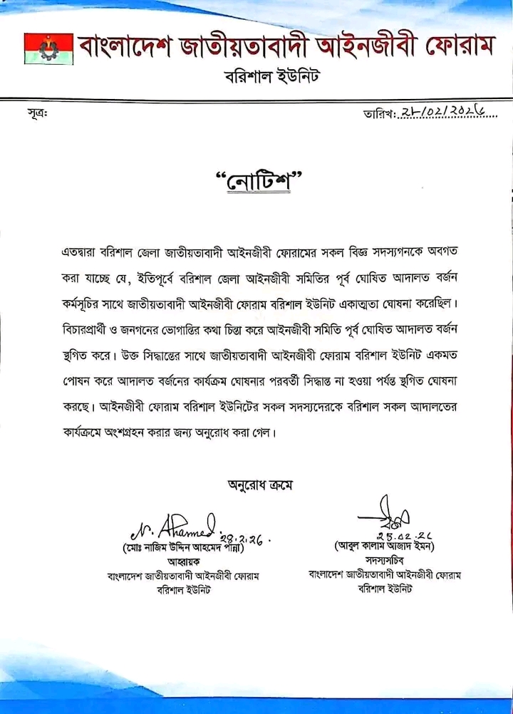 ২৬ ফেব্রুয়ারি জারি করা এক নোটিশে বরিশাল জেলা আইনজীবী সমিতির সম্পাদক মির্জা মো. রিয়াজ হোসেন জানান,বিচারপ্রার্থী জনগণের দুর্ভোগ বিবেচনা করে আগামী ১ মার্চ ২০২৬ থেকে পূর্বঘোষিত আদালত বর্জন কর্মসূচি স্থগিত করা হয়েছে।সকল আইনজীবীকে নিয়মিত আদালতের কার্যক্রমে অংশগ্রহণের জন্য আহ্বান জানানো হয়।