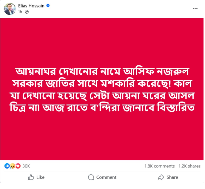 নিজস্ব প্রতিবেদক।।বিশিষ্ট অনলাইন অ্যাকটিভিস্ট এবং প্রবাসী সাংবাদিক ইলিয়াস হোসেন আজ (১৩ ফেব্রুয়ারি) তার ফেসবুক পেজে একটি গুরুত্বপূর্ণ ঘোষণা দিয়েছেন,যা তাত্ক্ষণিকভাবে তার অনুসারীদের মধ্যে আগ্রহ সৃষ্টি করেছে। তিনি তার পোস্টে জানান,যে চিত্রগুলো গতকাল দেখানো হয়েছিল,তা আয়না ঘরের আসল চিত্র নয়।এ কথা বলার মাধ্যমে ইলিয়াস, আসলে কিসের প্রতি ইঙ্গিত করেছেন,তা নিয়ে এখন জল্পনা শুরু হয়ে গেছে।