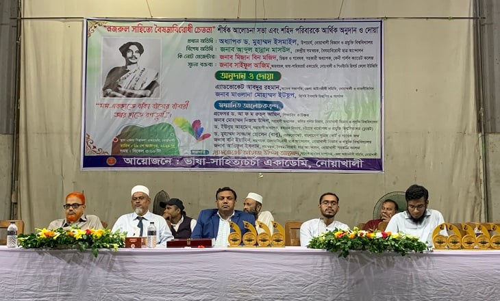 শনিবার সন্ধ্যায় ভাষা সাহিত্য চর্চা একাডেমি নোয়াখালীর আয়োজনে ‘নজরুল সাহিত্যে বৈষম্যবিরোধী চেতনা’ শীর্ষক আলোচনা এবং শহীদদের পরিবারে আর্থিক অনুদান ও দোয়া অনুষ্ঠানে অতিথির বক্তব্যে তিনি এসব কথা বলেন।
