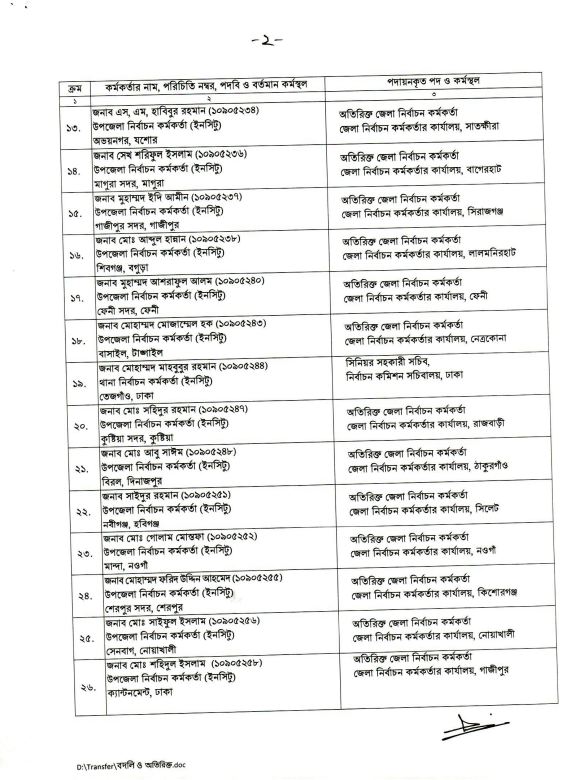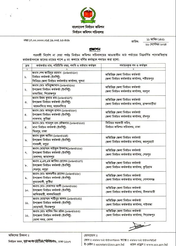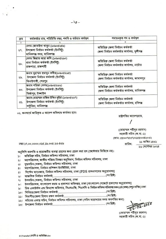 প্রজ্ঞাপনে জানানো হয়,৩১ জন কর্মকর্তাকে পদায়ন করে বিভিন্ন জেলার অতিরিক্ত জেলা নির্বাচন কর্মকর্তার দায়িত্ব দেওয়া হয়েছে।এই কর্মকর্তারা এতদিন জেলা নির্বাচন কর্মকর্তার কার্যালয়ে ‘নির্বাচন কর্মকর্তা’,উপজেলা নির্বাচন কর্মকর্তা,থানা নির্বাচন কর্মকর্তা হিসেবে দায়িত্ব পালন করে আসছিলেন।