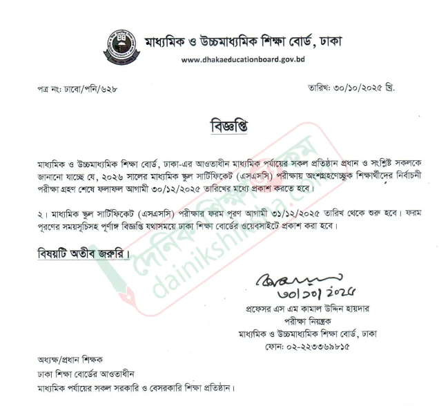 বিজ্ঞপ্তিতে জানা যায়,২০২৬ খ্রিষ্টাব্দের মাধ্যমিক স্কুল সার্টিফিকেট (এসএসসি) পরীক্ষায় অংশ নিতে ইচ্ছুক শিক্ষার্থীদের নির্বাচনী পরীক্ষা শেষে ফল আগামী ৩০ ডিসেম্বরের মধ্যে প্রকাশ করতে হবে।স্কুল সাপ্লাই