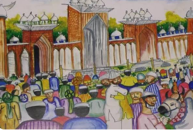 আঁখির আঁকা ছবিতে দেখা যাচ্ছে,বিশাল মিনারের সামনে ঈদের নামাজের জন্য কাতারবদ্ধ হয়ে দাঁড়িয়ে পাঞ্জাবি-টুপি পরা মানুষ।এর মধ্যে কোলাকুলি চলছে,কেউ আবার কোরবানির গরু নিয়ে যাচ্ছে।