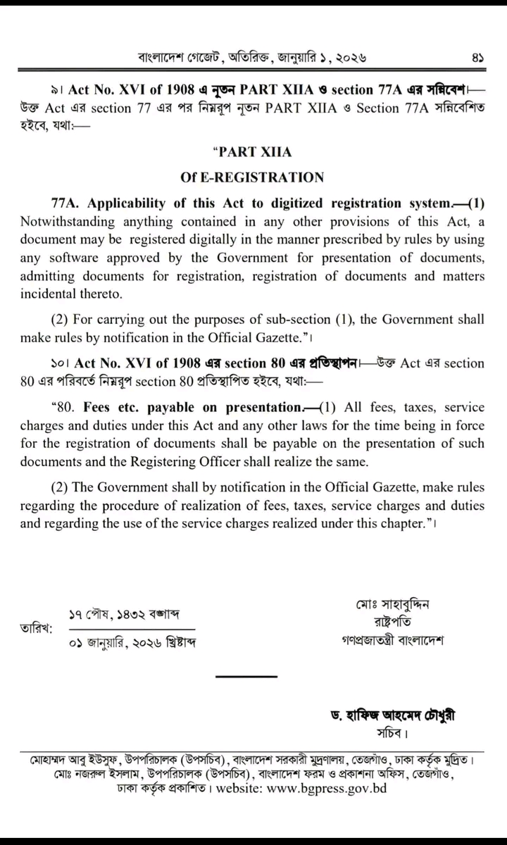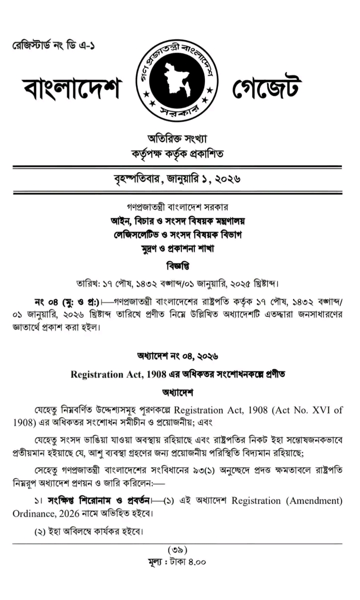 রাষ্ট্রপতি মোঃ সাহাবুদ্দিন গণপ্রজাতন্ত্রী বাংলাদেশের সংবিধানের ৯৩(১) অনুচ্ছেদে প্রদত্ত ক্ষমতাবলে সংসদ ভাঙিয়া থাকা অবস্থায় Registration (Amendment) Ordinance, 2026 জারি করেন।অধ্যাদেশটি বাংলাদেশ গেজেটের অতিরিক্ত সংখ্যায় ১ জানুয়ারি ২০২৬ তারিখে প্রকাশিত হয় এবং তাৎক্ষণিকভাবে কার্যকর হয়েছে।