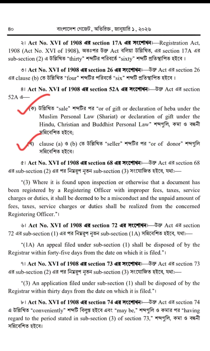 সংশোধিত অধ্যাদেশে রেজিস্ট্রেশন আইন,১৯০৮-এর একাধিক ধারায় পরিবর্তন আনা হয়েছে।এর মধ্যে সবচেয়ে আলোচিত পরিবর্তনটি এসেছে ধারা ৫২ক (Section 52A)–এ। এই ধারায় ‘sale’ শব্দের সঙ্গে হেবা/দান ও দানের ঘোষণার বিষয়টি যুক্ত করা হয়েছে।ফলে মুসলিম ব্যক্তিগত আইন (শরিয়ত) অনুযায়ী হেবা বা হেবার ঘোষণা এবং হিন্দু, খ্রিস্টান ও বৌদ্ধ ব্যক্তিগত আইন অনুযায়ী দানের ঘোষণাও এখন রেজিস্ট্রেশনযোগ্য হিসেবে স্বীকৃতি পেল।