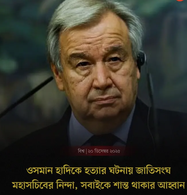 অনলাইন ডেস্ক রিপোর্ট।।ওসমান হাদিকে হত্যার ঘটনায় গভীর উদ্বেগ ও নিন্দা জানিয়েছেন জাতিসংঘের মহাসচিব।এক বিবৃতিতে তিনি এ ঘটনাকে “মর্মান্তিক ও উদ্বেগজনক” উল্লেখ করে বলেন,এ ধরনের সহিংসতা কোনোভাবেই গ্রহণযোগ্য নয় এবং তা সমাজের স্থিতিশীলতা ও আইনের শাসনের জন্য হুমকি।