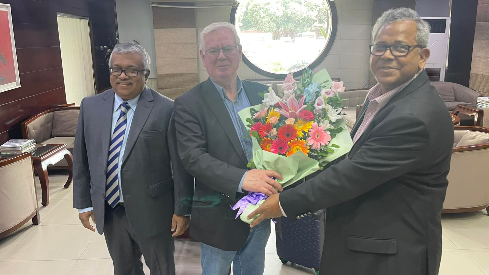 ইউরোপীয় ইউনিয়নের (ইইউ) মানবাধিকার বিষয়ক বিশেষ প্রতিনিধি ইমন গিলমোরকে ফুল দিয়ে অভ্যর্থনা জানাচ্ছেন ভারপ্রাপ্ত পররাষ্ট্র সচিব রিয়ার অ্যাডমিরাল খুরশেদ আলম।