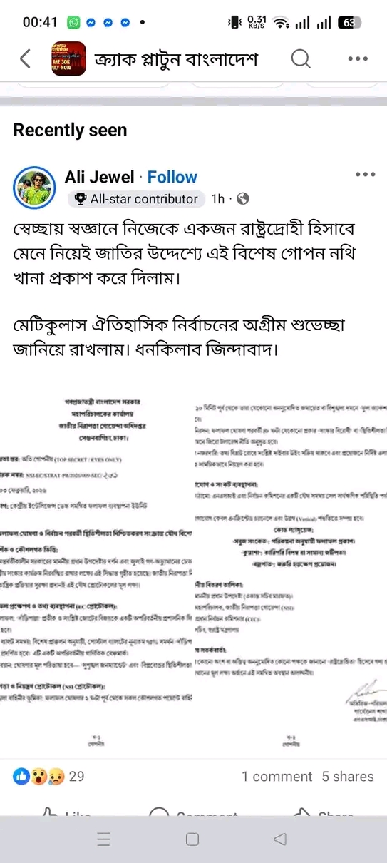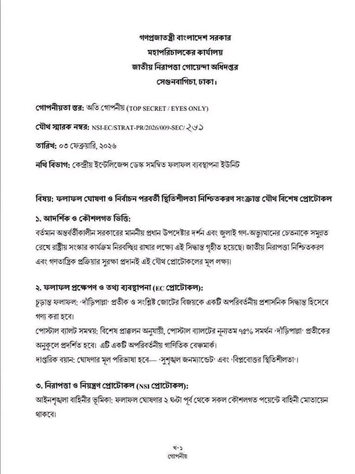 নিজস্ব প্রতিবেদক।।ফেসবুকে প্রকাশিত কথিত একটি ‘অতি গোপন’ রাষ্ট্রীয় নথি ঘিরে রাজনৈতিক অঙ্গনে ব্যাপক আলোচনা ও বিতর্ক সৃষ্টি হয়েছে।আলী জুয়েল নামের একটি ফেসবুক অ্যাকাউন্ট থেকে প্রকাশিত ওই স্ট্যাটাসে জাতীয় নিরাপত্তা গোয়েন্দা অধিদপ্তর (NSI) ও নির্বাচন কমিশনের যৌথ বিশেষ প্রোটোকল বলে দাবি করা একটি নথি সংযুক্ত করা হয়।তবে নথিটির সত্যতা সম্পর্কে সংশ্লিষ্ট কোনো রাষ্ট্রীয় প্রতিষ্ঠান এখনো আনুষ্ঠানিকভাবে কোনো বক্তব্য দেয়নি।
