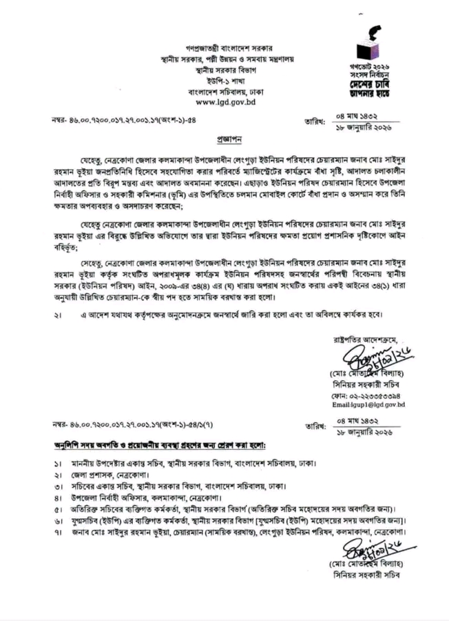 স্থানীয় সরকার (ইউনিয়ন পরিষদ) আইন,২০০৯-এর ৩৪(১) ধারা অনুযায়ী তাকে পদ থেকে সাময়িক বরখাস্ত করে রবিবার (১৮ জানুয়ারি) স্থানীয় সরকার বিভাগ থেকে প্রজ্ঞাপন জারি করা হয়। জনস্বার্থে জারিকৃত এই আদেশ তাৎক্ষণিকভাবে কার্যকর হয়েছে।