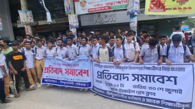 নিজস্ব প্রতিবেদক।।দেশ গড়ার প্রত্যয়ে জাতীয় নাগরিক পার্টি (এনসিপি) ঘোষিত ‘জুলাই সমাবেশে’ ক্লাস বাদ দিয়ে যেতে বাধ্য করার অভিযোগ তুলেছেন টাঙ্গাইলের বিন্দুবাসিনী সরকারি বালক উচ্চ বিদ্যালয়ের শিক্ষার্থীরা।এ ঘটনার প্রতিবাদ জানিয়ে বিক্ষোভ মিছিল ও সমাবেশ করেছেন একদল শিক্ষার্থী।