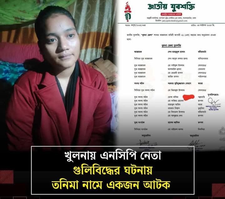 খুলনা প্রতিনিধি।।খুলনায় জাতীয় নাগরিক পার্টির শ্রমিক সংগঠন শ্রমিকশক্তির কেন্দ্রীয় সংগঠক ও খুলনা বিভাগীয় কমিটির আহ্বায়ক মোতালেব শিকদারকে গুলিবিদ্ধ করার ঘটনায় এক নারীকে আটক করেছে পুলিশ।