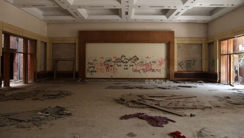 অনেক কক্ষের সিলিংয়ে এখনো ঝুলছে ভাঙা ঝাড়বাতির অংশবিশেষ।