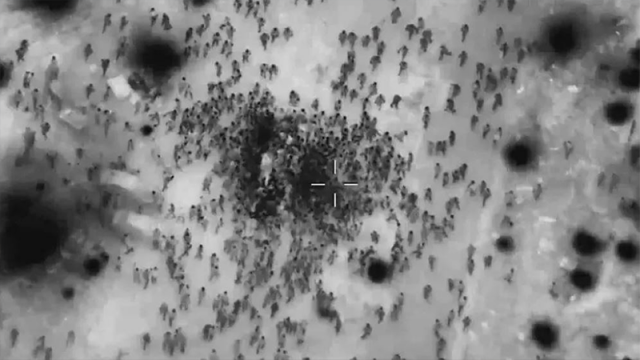 ওপর থেকে নেওয়া চিত্রে দেখা গেছে,খাবারের জন্য ত্রাণবাহী ট্রাক ঘিরে আছেন শত শত ফিলিস্তিনি।সেখানে ত্রাণবাহী ট্রাক খালি পড়ে আছে।আর নিহতদের একটি গাধার গাড়ি বোঝাই করে নিয়ে যাওয়া হচ্ছে।