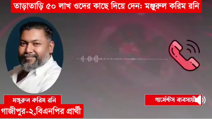 ভাইরাল হওয়া ফোনকলে একজন ব্যক্তিকে নিজেকে গাজীপুর-২ আসনের বিএনপির প্রার্থী ও গাজীপুর মহানগর বিএনপির সাধারণ সম্পাদক এম মঞ্জুরুল করিম রনি হিসেবে পরিচয় দিতে শোনা যায় বলে দাবি করা হচ্ছে।ওই কথোপকথনে সংশ্লিষ্ট ব্যবসায়ীর কাছে নির্দিষ্ট অঙ্কের অর্থ ‘দলীয় কাজ’ ও ‘নির্বাচনী ব্যবস্থাপনা’র নামে দাবি করা হয়েছে বলেও অভিযোগ উঠেছে।