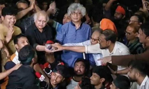 আজ রোববার দুপুরে বিশ্ববিদ্যালয়ের শহীদ মিনারের সামনে এই মানববন্ধন হয়।