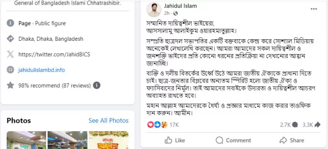 ফেসবুক পোস্টে তিনি লিখেছেন,সম্মানিত দায়িত্বশীল ভাইয়েরা,আসসালামু আলাইকুম ওয়ারহমাতুল্লাহ।সম্প্রতি ছাত্রদল সভাপতির একটি বক্তব্যকে কেন্দ্র করে সোশ্যাল মিডিয়ায় অনেকেই লেখালেখি করছেন।আমরা আমাদের সব দায়িত্বশীল ও জনশক্তি ভাইদের প্রতি কোনো ধরনের প্রতিক্রিয়া না দেখানোর আহ্বান জানাচ্ছি।’