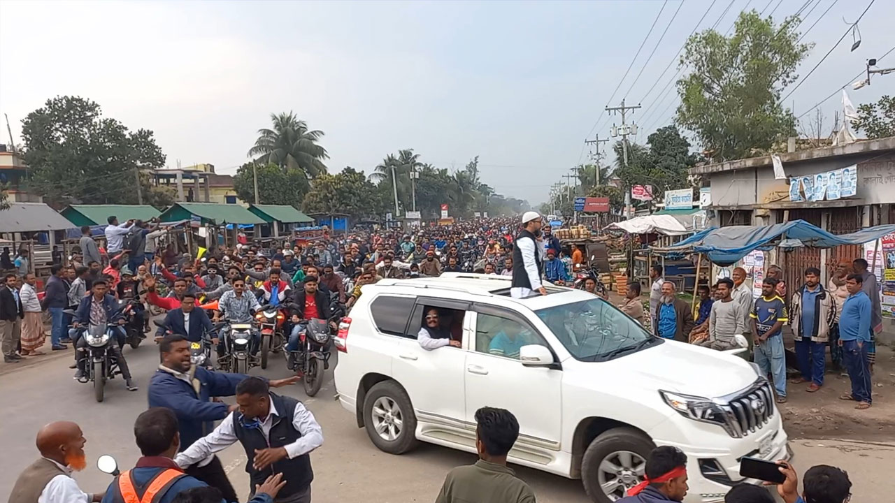 জয়পুরহাট প্রতিনিধি।।একটি সাদা রঙের ল্যান্ডক্রুজার গাড়ি। গাড়িটির পেছনে পাঁচ হাজারের বেশি মোটরসাইকেলের বিশাল বহর,রয়েছে কয়েক হাজার কর্মী-সমর্থক।আর সেই গাড়িটির হুড খোলা অংশ দিয়ে উপজেলা চেয়ারম্যান মিনফুজুর রহমান দাঁড়িয়ে হাত নাড়িয়ে লোকজনদের শুভেচ্ছা জানাচ্ছেন। সড়কের দুই পাশে দাঁড়িয়ে থাকা লোকজনও হাত নাড়িয়ে তাকে শুভেচ্ছা জানাচ্ছেন।