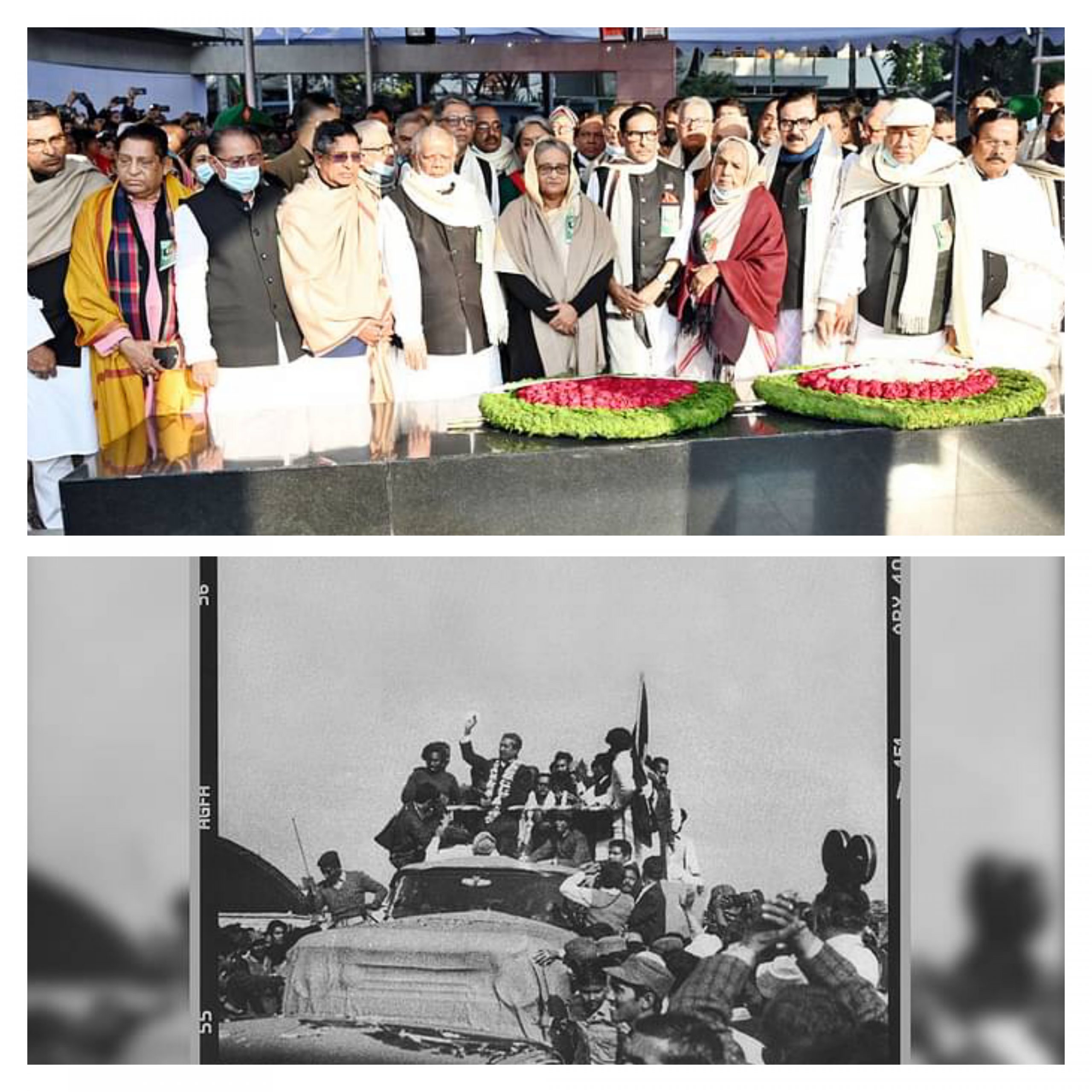 নিজস্ব প্রতিবেদক।।স্বাধীনতা অর্জনের পর জাতির পিতা বঙ্গবন্ধু শেখ মুজিবুর রহমানের দেশে ফেরার দিনটি নানা কর্মসূচির মধ্য দিয়ে পালিত হচ্ছে বাংলাদেশে। মুক্তিযুদ্ধে বিজয়ের ২৪ দিন পর পাকিস্তানে বন্দিদশা থেকে মুক্ত হয়ে ১৯৭২ সালের ১০ জানুয়ারি দেশে ফিরেছিলেন বাঙালির অবিসংবাদিত নেতা শেখ মুজিব।দিনটি জাতির জনকের স্বদেশ প্রত্যাবর্তন দিবস হিসেবে পালিত হয়ে আসছে। দিবসটি উপলক্ষে মঙ্গলবার ভোরে আওয়ামী লীগের কেন্দ্রীয় কার্যালয়,বঙ্গবন্ধু ভবনসহ সারাদেশে দলীয় কার্যালয়ে জাতীয় ও দলীয় পতাকা উত্তোলন করা হয়।পরে ধানমণ্ডিতে বঙ্গবন্ধুর প্রতিকৃতিতে শ্রদ্ধা নিবেদনের মধ্য দিয়ে শুরু হয় দিবসের কর্মসূচি। সকাল সাড়ে ৮টার দিকে প্রধানমন্ত্রী শেখ হাসিনা ধানমণ্ডির ৩২ নম্বর সড়কে বঙ্গবন্ধুর প্রতিকৃতিতে ফুল দিয়ে শ্রদ্ধা জানান।পরে তিনি সেখানে মোনাজাতে অংশ নেন। প্রধানমন্ত্রী হিসেবে শ্রদ্ধা নিবেদনের পর আওয়ামী লীগ প্রধান হিসেবে দলীয় নেতাদের সঙ্গে নিয়ে আবারও বঙ্গবন্ধুর প্রতিকৃতিতে ফুল দেন শেখ হাসিনা। ছাত্রলীগ,যুবলীগ,যুব মহিলা লীগ,স্বেচ্ছাসেবক লীগসহ আওয়ামী লীগের সহযোগী সংগঠনের নেতাকর্মীরাও পরে শ্রদ্ধা নিবেদন করেন। ১৯৭১ সালের ২৫ মার্চ বঙ্গবন্ধুকে তার ধানমণ্ডির ৩২ নম্বর সড়কের বাসভবন থেকে পাকিস্তানি সেনারা আটক করে তৎকালীন পশ্চিম পাকিস্তানে নিয়ে যায়। ওই রাতেই বাংলাদেশের নিরস্ত্র মানুষের ওপর শুরু হয় বর্বর হামলা। পাকিস্তানি বাহিনীর হাতে গ্রেপ্তার হওয়ার আগে স্বাধীনতার ঘোষণা দিয়ে যান বঙ্গবন্ধু।তার ডাকে বাঙালি ঝাঁপিয়ে পড়ে মুক্তি সংগ্রামে। নয় মাসের রক্তক্ষয়ী যুদ্ধ শেষে ১৯৭১ সালের ১৬ ডিসেম্বর পাকিস্তানি বাহিনীর আত্মসমর্পণের মধ্য দিয়ে বিশ্ব মানচিত্রে স্বাধীন বাংলাদেশের অভ্যুদয় ঘটে। মুক্তিযুদ্ধে বিজয়ের পর বিশ্ব জনমতের চাপে ১৯৭২ সালের ৮ জানুয়ারি বঙ্গবন্ধুকে মুক্তি দিতে বাধ্য হয় পাকিস্তান সরকার। মুক্তির পর তিনি লন্ডন যান।সেখান থেকে ১০ জানুয়ারি দিল্লি হয়ে পৌঁছান ঢাকায়। লাখো জনতা সেদিন তাদের প্রিয় নেতাকে তেজগাঁও বিমানবন্দর থেকে খোলা ট্রাকে করে তৎকালীন রেসকোর্স ময়দানে (বর্তমানে সোহরাওয়ার্দী উদ্যান) নিয়ে যায়। বঙ্গবন্ধু সেখানে সদ্য স্বাধীন জাতির উদ্দেশে ভাষণ দেন।প্রায় কুড়ি মিনিটের সেই আবেগঘন বক্তৃতায় তিনি বলেন,পশ্চিম পাকিস্তানে বন্দিদশায় তিনি ফাঁসিকাষ্ঠে যাওয়ার জন্য প্রস্তুত ছিলেন।কিন্তু তিনি জানতেন,বাঙালিকে কেউ ‘দাবায় রাখতে’ পারবে না। “আমার বাংলাদেশ আজ স্বাধীন হয়েছে।আমার জীবনের সাধ আজ পূর্ণ হয়েছে। আমার বাংলার মানুষ আজ মুক্ত হয়েছে।” শ্রদ্ধা নিবেদন শেষে আওয়ামী লীগের সাধারণ সম্পাদক ওবায়দুল 