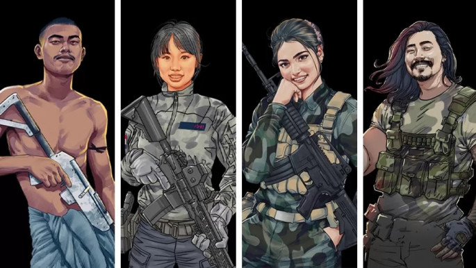জান্তা-বিরোধী লড়াইয়ে অংশ নেওয়া সমাজের বিভিন্ন শ্রেণির মানুষের বাস্তব চরিত্রগুলোর অনুকরণেই গেম ক্যারেক্টারগুলো তৈরি করা হয়েছে। ছবি: বিবিসি