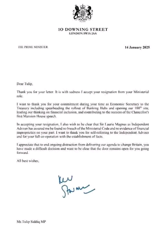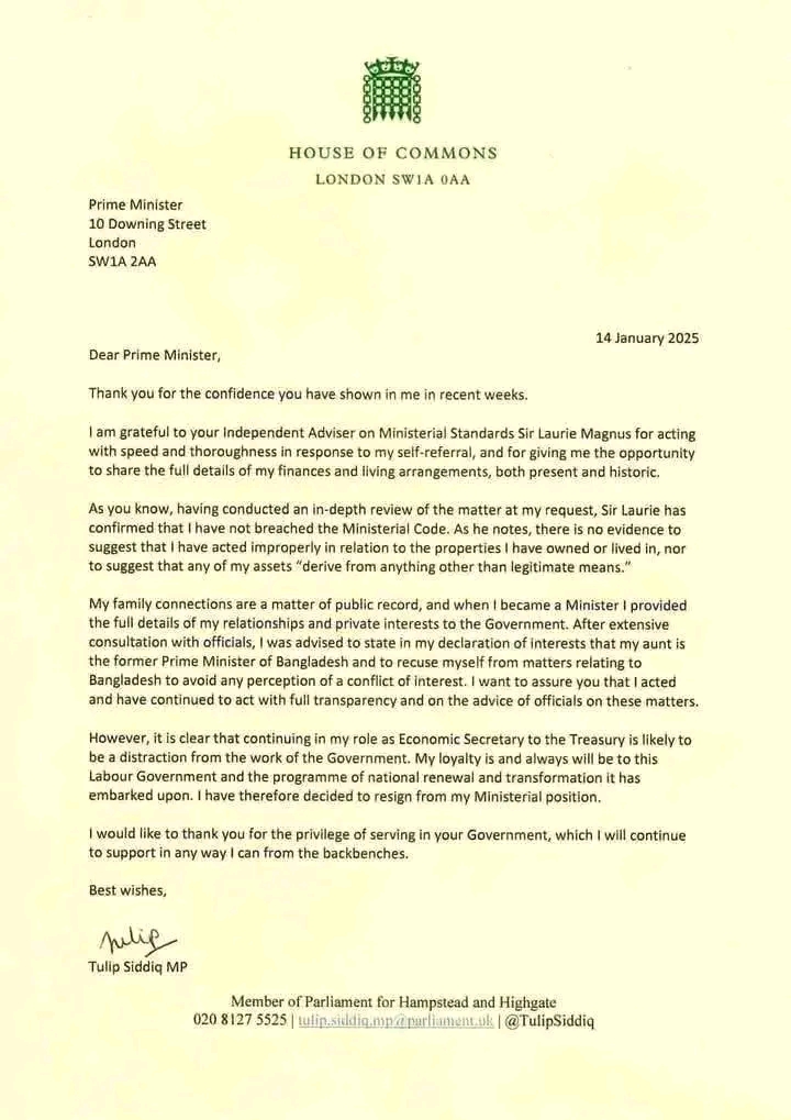 টিউলিপের পদত্যাগপত্র,তাঁকে ধন্যবাদ জানিয়ে স্টারমারের চিঠি ও তদন্ত নিয়ে প্রধানমন্ত্রীকে দেওয়া লাউরির চিঠি পাঠকদের জন্য তুলে ধরা হলো।