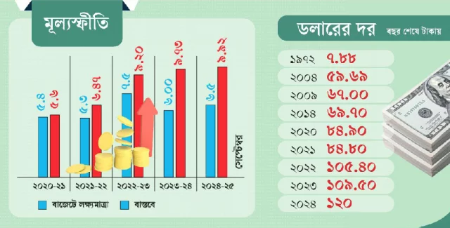 নিজস্ব প্রতিবেদক।।দেশে ডলার সরবরাহে সংকট ও দামে অস্বাভাবিক ঊর্ধ্বগতি মূল্যস্ফীতিকে উসকেছে।রাশিয়া-ইউক্রেন যুদ্ধকেন্দ্রিক বৈশ্বিক অস্থিরতা আরও উসকে দিয়েছে বাজারে ডলারের এই অস্থিশীলতাকে।ফলে দিন দিন ডলার আরও দামি হয়েছে এবং টাকার মান আশঙ্কাজনক হারে কমেছে।এই পরিস্থিতি জ্বালানি,সার,তেল,শিশুখাদ্যসহ সব ধরনের আমদানি খরচের পাশাপাশি স্থানীয় ও বৈদেশিক রুটে সড়ক, নৌ ও আকাশপথের পরিবহন ব্যয় বাড়িয়ে তুলেছে।এসবের সার্বিক প্রভাব পড়েছে ভোগ্য,ব্যবহার্য ও সেবার দামের ওপর; যা দেশকে দুই অঙ্কের মূল্যস্ফীতির মুখোমুখি করেছে। অবশ্য অর্থনৈতিক বিশ্লেষকেরা এ দাবির পক্ষে অভিন্ন মতামত দিয়ে ঊর্ধ্বগতির এই মূল্যস্ফীতির পেছনে তাঁরা কিছু বাড়তি দুষ্টচক্র সূচককেও যোগ করেছেন।বলেছেন,দুর্বল বাজার মনিটরিং,ব্যবসায়ীদের অতি মুনাফা,ঘাটে ঘাটে চাঁদাবাজি, আইনের সঠিক ব্যবহার না হওয়া এবং দৃষ্টান্তমূলক শাস্তির নজির তৈরি না হওয়াও এর জন্য দায়ী। বাংলাদেশ ব্যাংকের তথ্য পর্যালোচনায় দেখা যায়,ডলারের বিপরীতে টাকার মান প্রায় ৪ বছরে কমেছে ৩৫ টাকা ২০ পয়সা বা ৪১ দশমিক ৫১ শতাংশ; যা মূল্যস্ফীতিকে সরাসরি চোখ রাঙিয়েছে।এ কারণে সরকার বাজেটে মূল্যস্ফীতির লক্ষ্য সাড়ে ৬ শতাংশে ধরে রাখার ঘোষণা দিলেও সেটি ইতিমধ্যে দুই অঙ্কের কোটা ১১ দশমিক ৬৬ শতাংশ ছাড়িয়েছে। সংশ্লিষ্টরা জানিয়েছেন,ঊর্ধ্বগতির এই মূল্যস্ফীতির চাপে এখন শুধু সীমিত আয়ের মানুষই বিপাকে পড়েনি,ভিত্তি দুর্বল করে তুলেছে মধ্যবিত্তেরও। জানা যায়,দেশে ১৯৭২ সালে প্রতি ডলারের দাম ছিল ৭ টাকা ৮৮ পয়সা; যা ২০০৪ সালে হয় ৫৯ টাকা ৬৯ পয়সা। আওয়ামী লীগ সরকার ২০০৯ সালে ক্ষমতায় আসার পরে ওই ডলারের দাম পৌঁছায় ৬৭ টাকা।পরে দ্বিতীয় মেয়াদে ২০১৪ সালে প্রতি ডলারের দাম দাঁড়ায় ৬৯ টাকা ৭০ পয়সা। পর্যায়ক্রমে তা ২০২০ এবং ২০২১ সালে দাঁড়ায় ৮৪ টাকা ৯০ পয়সা এবং ৮৪ টাকা ৮০ পয়সা।কিন্তু ২০২২ সালে ইউক্রেন যুদ্ধের জেরে ডলারের তেজ বাড়তে থাকায় সবশেষ প্রতি ডলারের দর দাঁড়িয়েছে ১২০ টাকায়;যা খোলাবাজারে বিক্রি হচ্ছে ১২৫ টাকা।আর এতেই লাগামহীন হয়ে পড়ে মূল্যস্ফীতি। ডলারের সংকট উসকে দিচ্ছে মূল্যস্ফীতি ডলারের দর বাজারের ওপর ছেড়ে না দিয়ে একটা দীর্ঘ সময় আটকে রেখে হঠাৎ ছেড়ে দেওয়ায় দেশে ডলারের দরে এই অস্থিরতা তৈরি হয়েছে বলে মনে করেন বাংলাদেশ অর্থনীতি সমিতির সাবেক সভাপতি অধ্যাপক ড. মইনুল ইসলাম।তিনি বলেন,এতে জ্বালানি,পরিবহন এবং আমদানি পণ্যের দাম হঠাৎ কর বেড়ে গেছে; যার চাপ সামলাতে মানুষ হিমশিম খাচ্ছে। ভোক্তাদের দুর্গতি ডেকে এনেছে। ২০২২ সালের ইউক্রেন যুদ্ধের জেরে ২০২১ সালের ডিসেম্বরের ৮৪ টাকা ৮০ পয়সার ডলারের দাম পরের বছর হয় 
