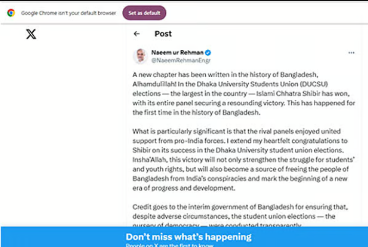 পাকিস্তান জামায়াতে ইসলামীর আমীর নাইম–উর–রহমানের এক্স পোস্টে ইসলামী ছাত্র শিবিরকে অভিনন্দন জানিয়ে দেওয়া বার্তার একাংশ।পরে অবশ্য এটি মুছে ফেলা হয়।