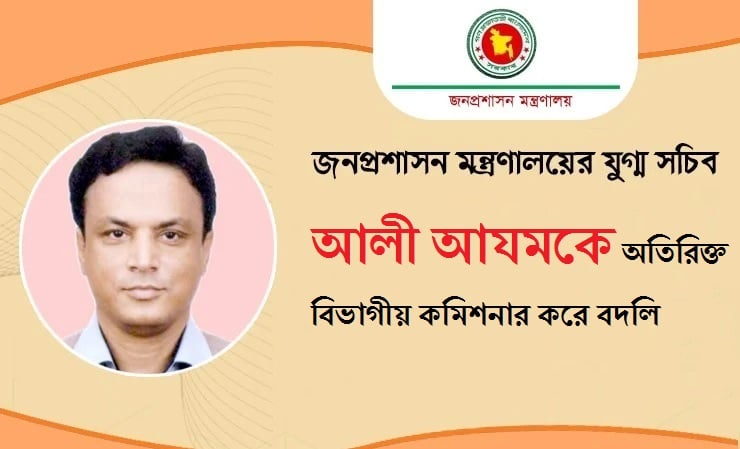 বুধবার (১৮ সেপ্টেম্বর) জনপ্রশাসন মন্ত্রণালয় থেকে এক প্রজ্ঞাপনে এ তথ্য নিশ্চিত করা হয়েছে।এছাড়া জনপ্রশাসন মন্ত্রণালয়ের একাধিক সূত্র আলী আযমের বদলির খবর ঢাকা টাইমসকে নিশ্চিত করেছে।