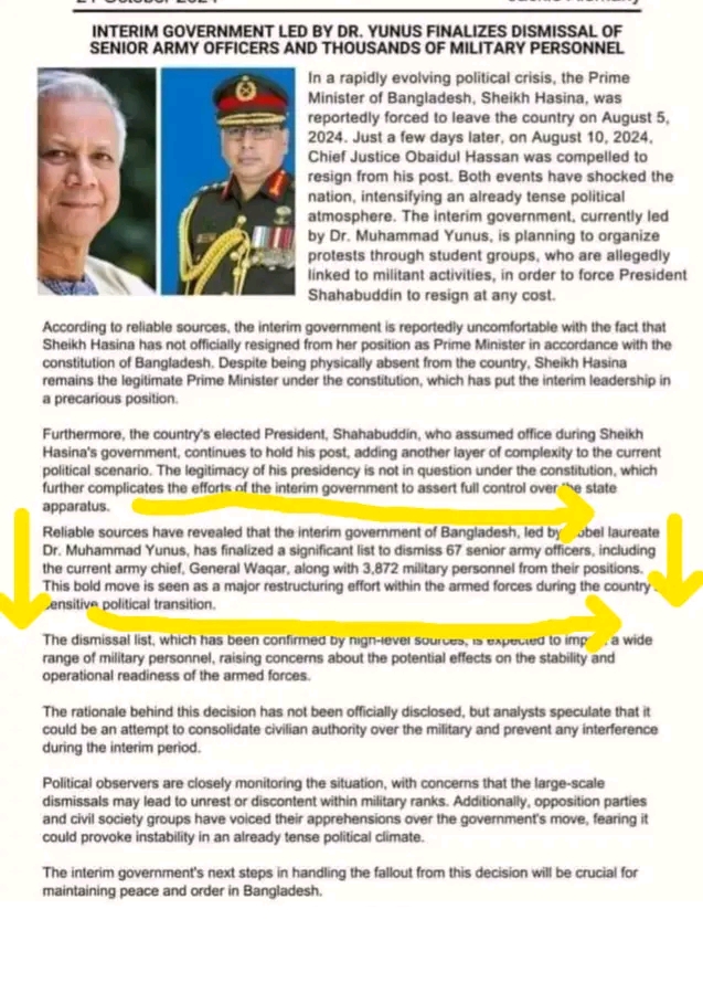 INTERIM GOVERNMENT LED BY DR. YUNUS FINALIZES DISMISSAL OF SENIOR ARMY OFFICERS AND THOUSANDS OF MILITARY PERSONNEL