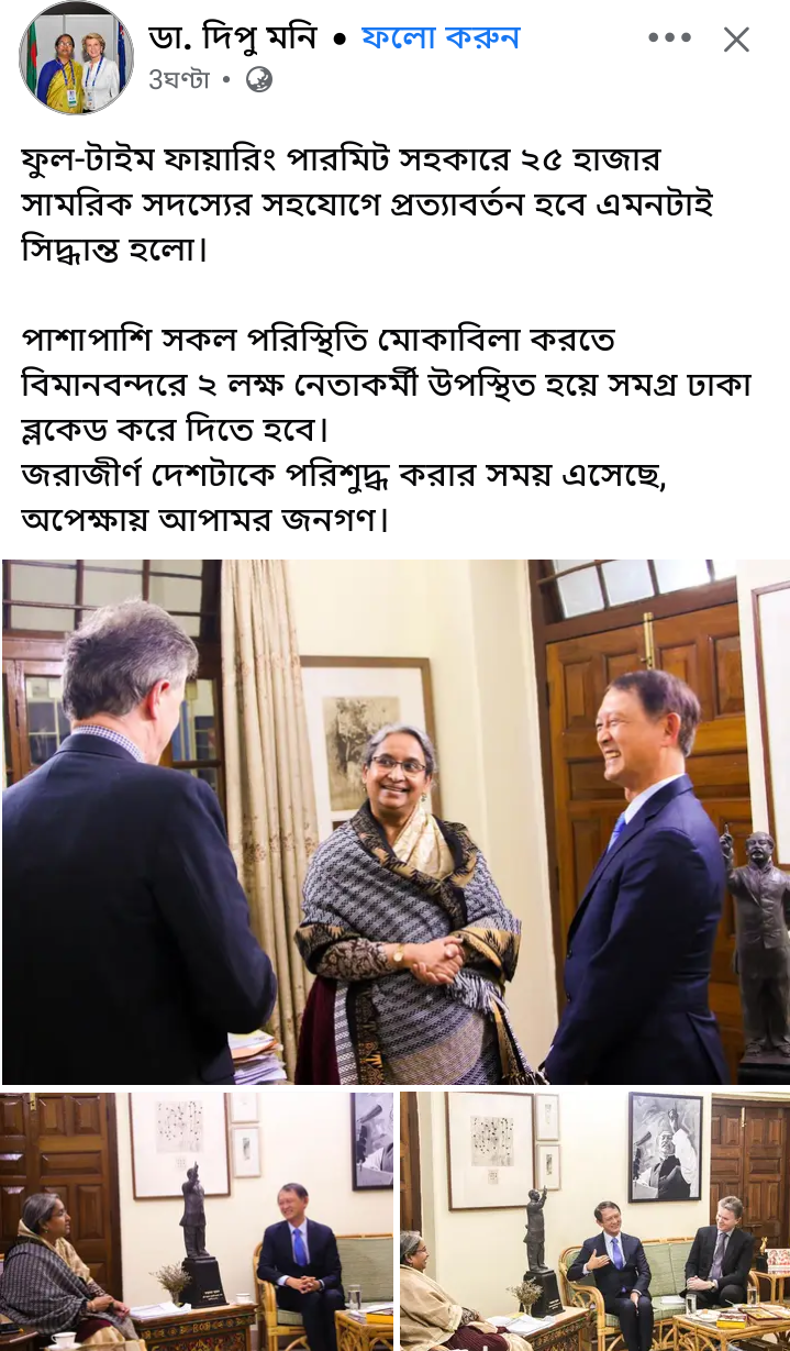 নিজস্ব প্রতিবেদক।।আওয়ামী লীগের কেন্দ্রীয় যুগ্ম সম্পাদক ও সাবেক পররাষ্ট্র ও শিক্ষা মন্ত্রী ড. দীপু মনির একটি ভেরিফাইড ফেসবুক স্ট্যাটাস এখন ভাইরাল এবং তা নিয়ে দেশের রাজনৈতিক মহলে তীব্র আলোচনা ও সমালোচনা চলছে।