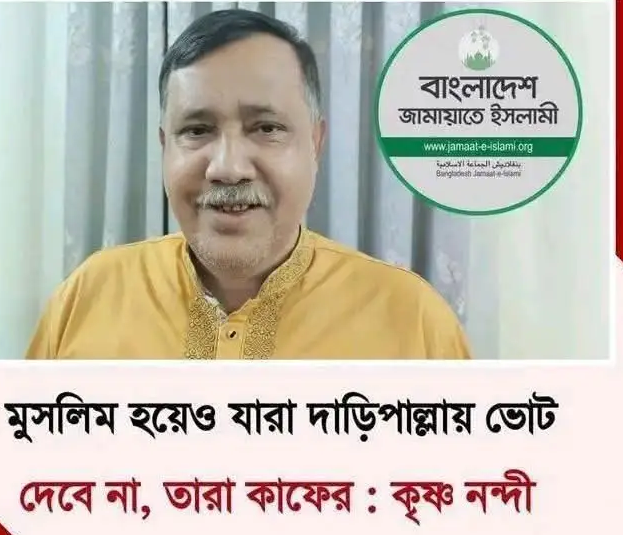 নিজস্ব প্রতিবেদক।।”মুসলিম হয়েও যারা দাড়িপাল্লায় ভোট দেবে না, তারা কাফের”—এমন মন্তব্য করে নতুন করে বিতর্কে জড়িয়েছেন কৃষ্ণ নন্দী নামে এক বক্তা।সামাজিক যোগাযোগমাধ্যমে ছড়িয়ে পড়া তার এই বক্তব্যকে কেন্দ্র করে ধর্মীয় অনুভূতিতে আঘাত,ভোটারকে ভয়ভীতি প্রদর্শন এবং আইন লঙ্ঘনের অভিযোগ উঠেছে।