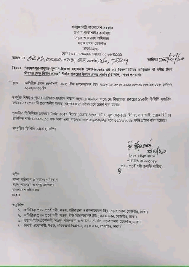 নিজস্ব প্রতিবেদক।।আড়িয়াল খাঁ নদীর ওপর মীরগঞ্জ সেতু বরিশালের বাবুগঞ্জ,মুলাদী,হিজলা ও মেন্দিগঞ্জ উপজেলার মানুষের দীর্ঘদিনের প্রানের দাবি ছিল।গত সরকারের আমলে প্রকল্পটি জাতীয় সংসদে একনেকে পাস হয়।তখন সেতু বাস্তবায়নের জন্য উদ্যোগী ভূমিকা রাখেন বরিশাল–৩ আসনের সংসদ সদস্য গোলাম কিবরিয়া টিপু,বরিশাল ৪আসনের সংসদ সদস্য পংকজ দেবনাথ এবং মুলাদীর কৃতি সন্তান সাবেক মন্ত্রিপরিষদ সচিব মাহবুব আলম।