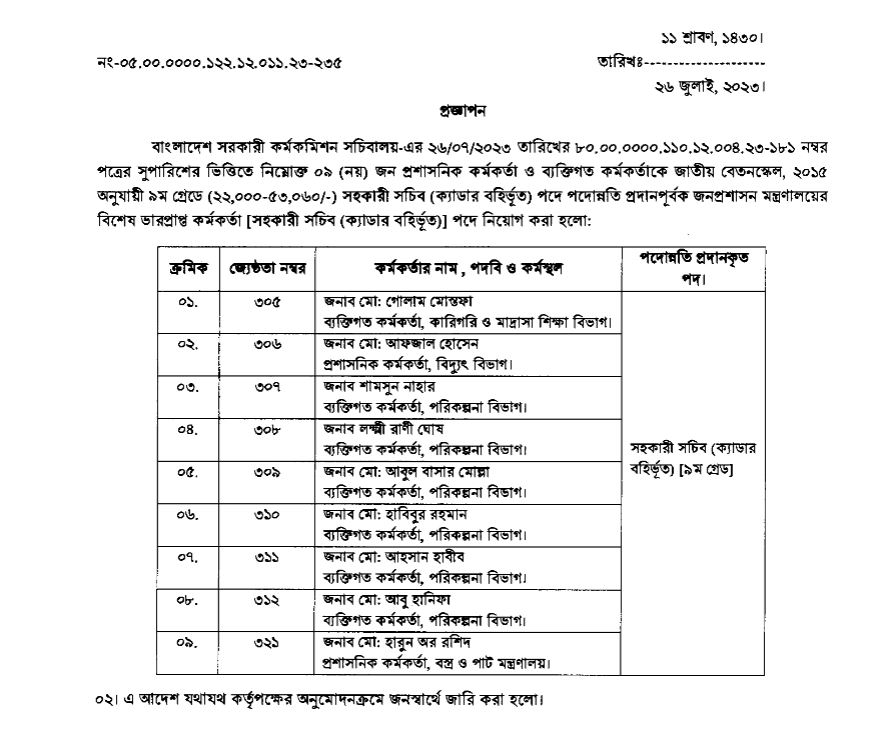 এতে বলা হয়, বাংলাদেশ সরকারি কর্মকমিশন সচিবালয়ের সুপারিশের ভিত্তিতে তাদের পদোন্নতি দেয়া হয়েছে।