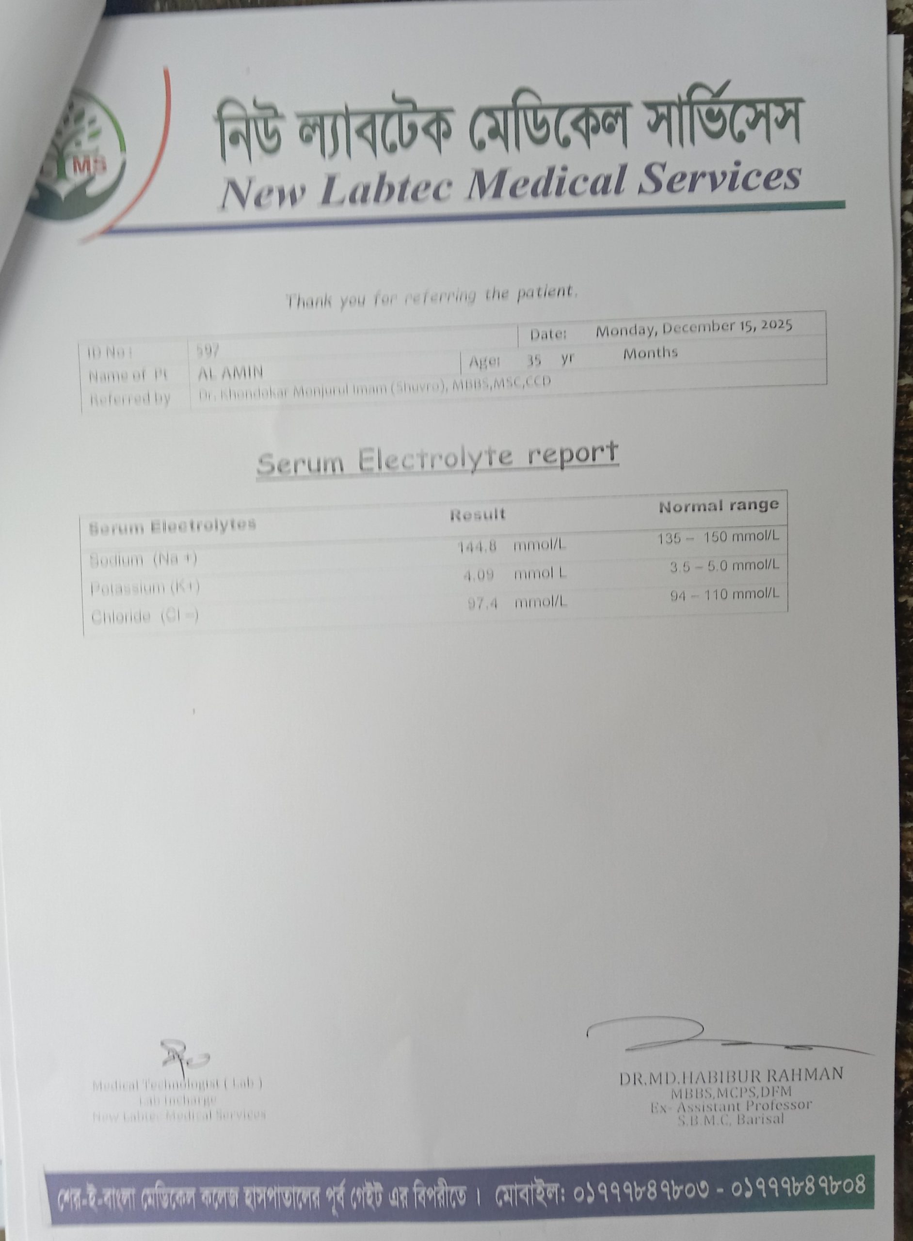 Serum Electrolytes: Sodium 144.8 mmol/L (স্বাভাবিক)