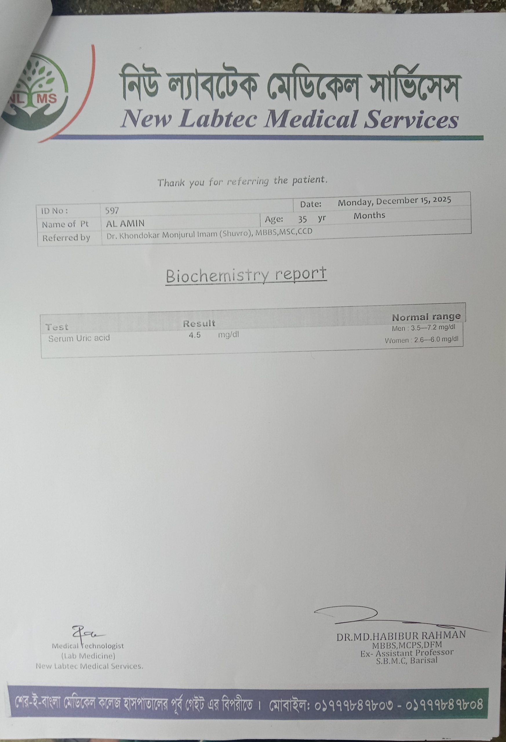 Serum Uric Acid: 4.5 mg/dL (স্বাভাবিক)