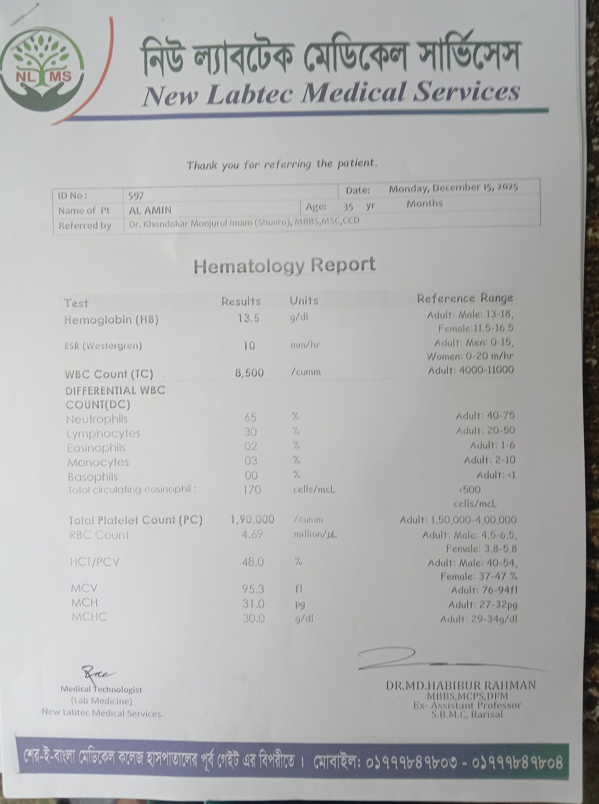 WBC: 8,500 /cumm (স্বাভাবিক)