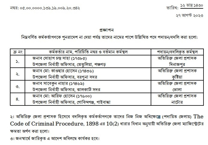 প্রজ্ঞাপনে আরও বলা হয়েছে,অতিরিক্ত জেলা প্রশাসক হিসেবে বদলি কর্মকর্তাদের নিজ নিজ অধিক্ষেত্রে (পদায়িত জেলায়) অতিরিক্ত জেলা ম্যাজিস্ট্রেটের ক্ষমতা অর্পণ করা হলো। জনস্বার্থে জারিকৃত এ আদেশ অবিলম্বে কার্যকর হবে।